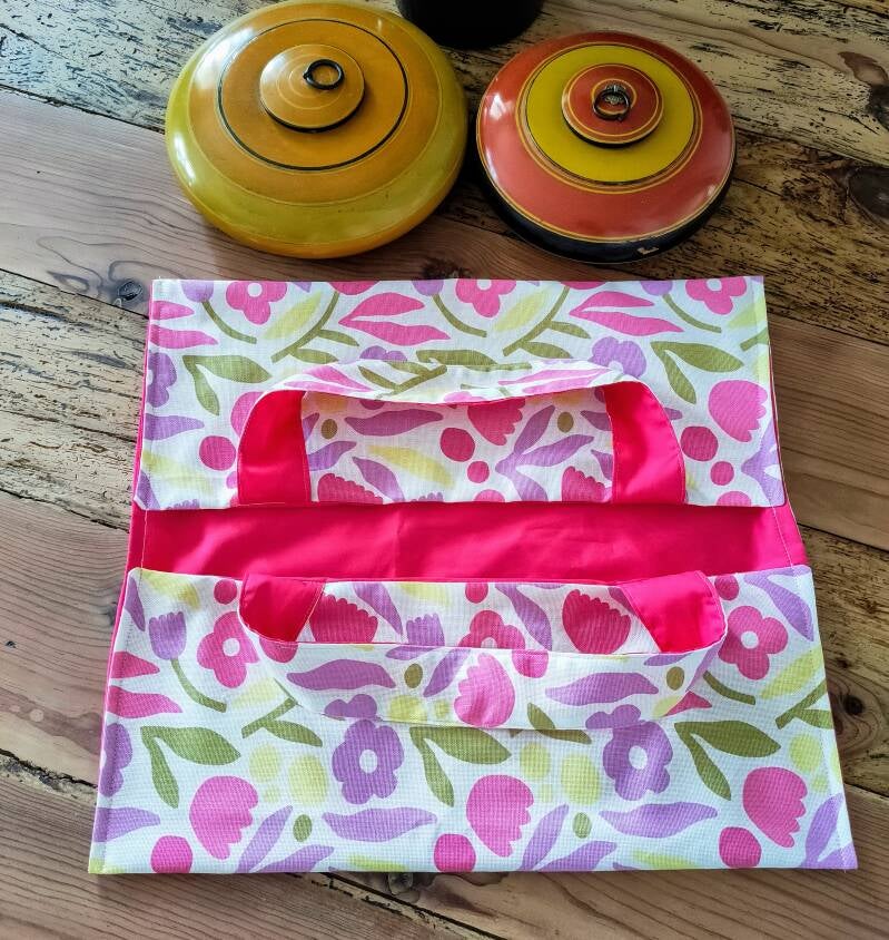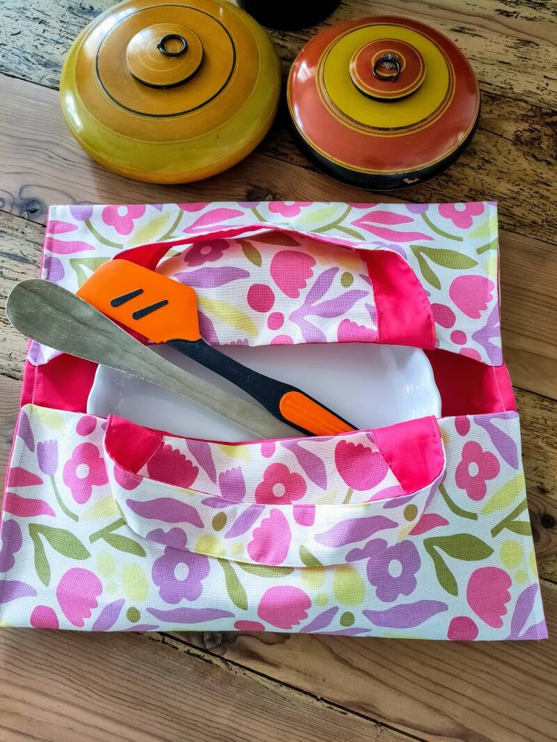 Ce modèle associe un tissu fleuri joyeux à une doublure fuchsia dynamique pour une finition impeccable. Il est doté de deux poignées solides, faciles à prendre en main, même avec un plat bien garni !