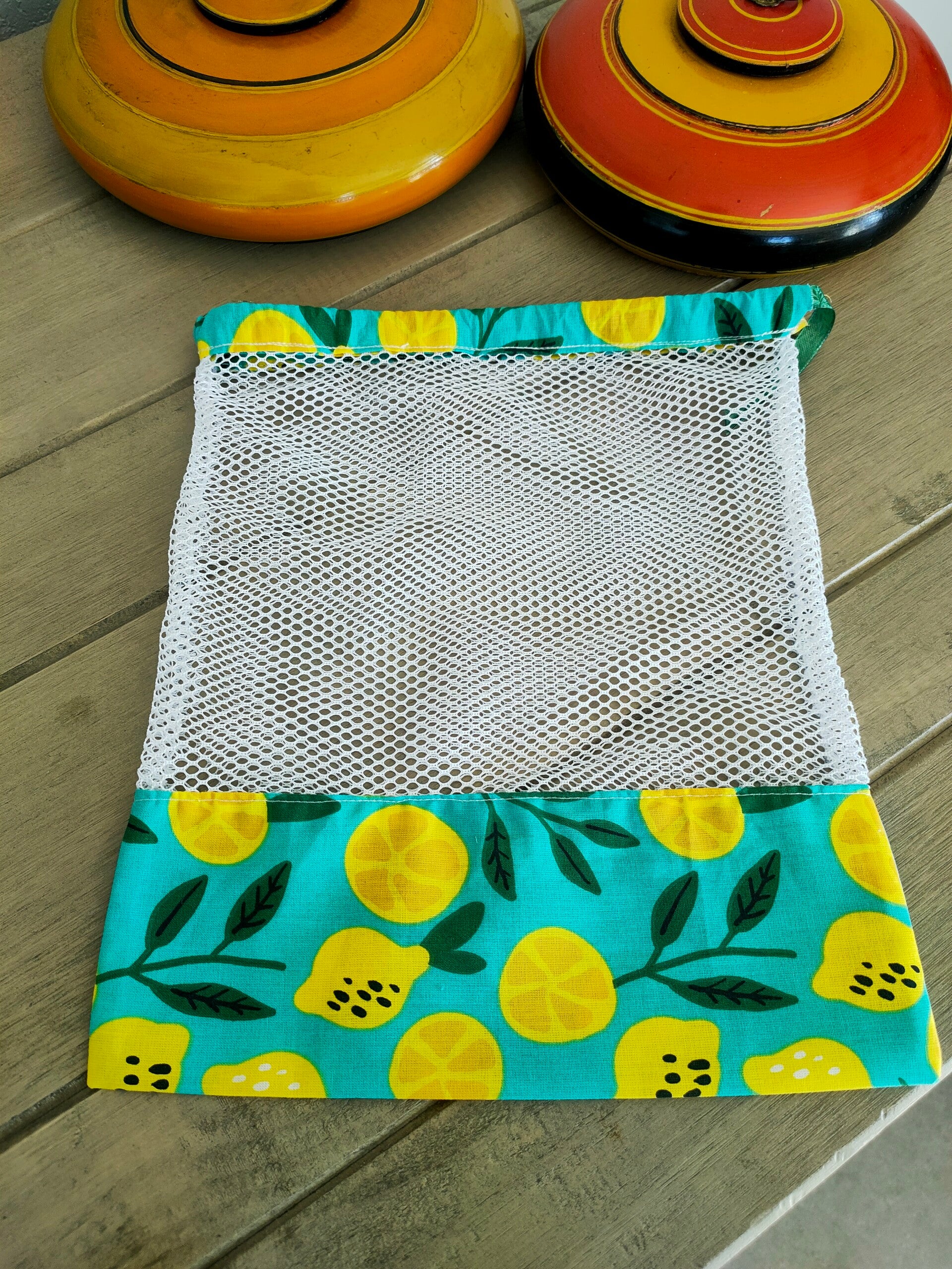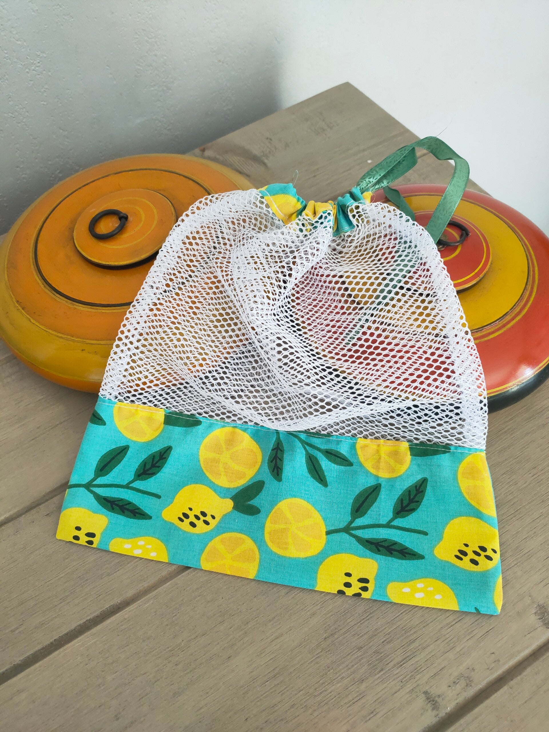 Sac en filet mesh blanc et coton motif citronTaille 28*24cmIdéal pour aller chercher ses fruits et légumes au marché.