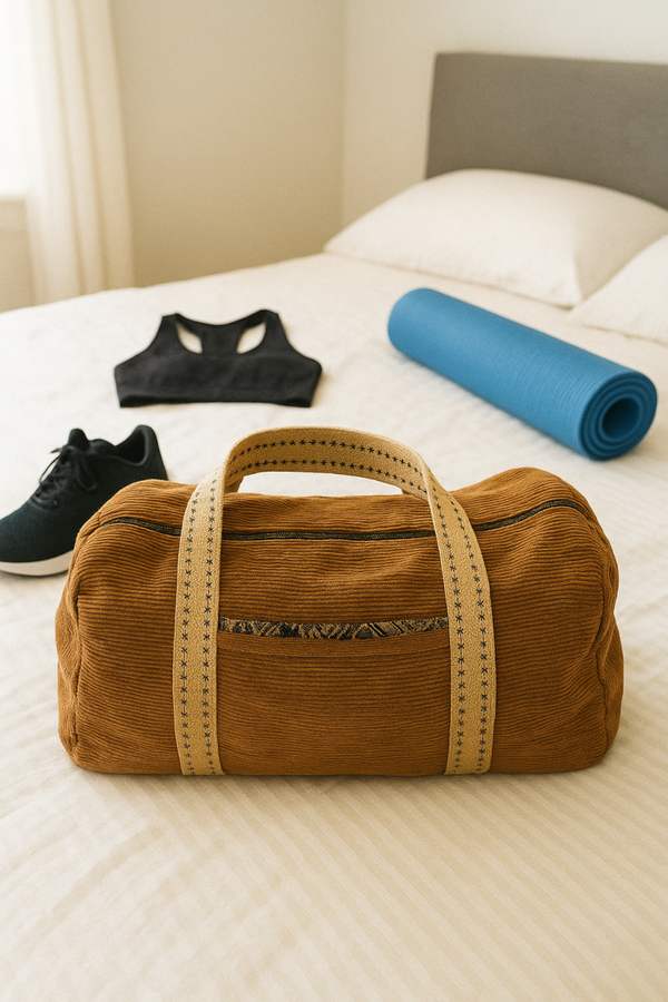 Ce joli sac week-end en velours côtelé camel allie style rétro et praticité. Sa texture douce et sa couleur chaleureuse en font un accessoire unique, idéal pour une escapade, une séance de sport ou une utilisation quotidienne.